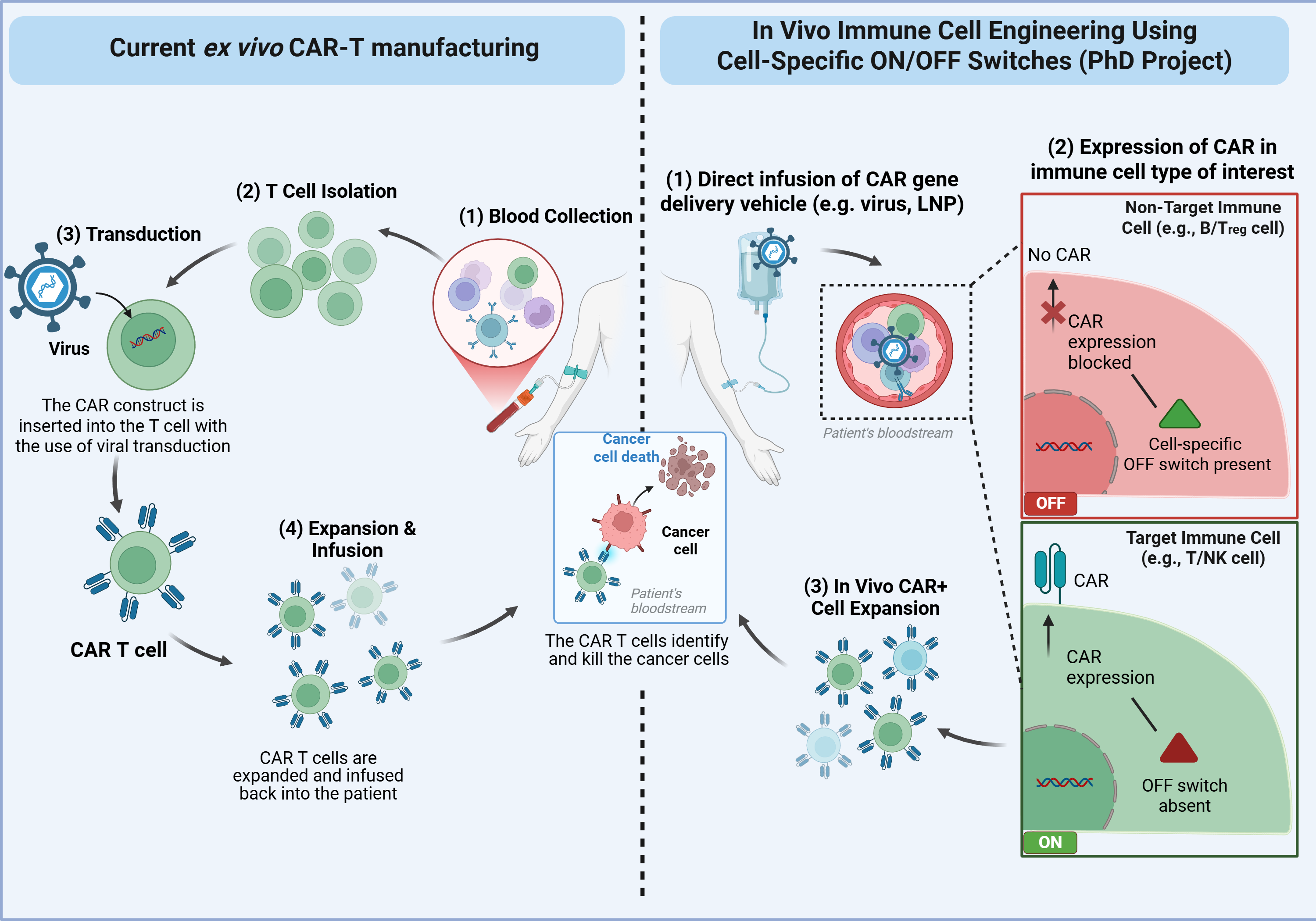 My project is developing a safer and more accessible way to deliver CAR therapies—treatments that use chimeric antigen receptors (CARs), which are synthetic receptors that reprogram a patient’s immune cells to recognize and destroy cancer cells. Current CAR therapies are highly effective against certain blood cancers, but they require removing immune cells from the patient, engineering them in specialized laboratories, and infusing them back – a process that is slow and costly, limiting who can access treatment. Delivering CAR therapies directly inside the body could overcome these barriers, but requires precise control to ensure the therapy activates only in the intended immune cells and remains inactive in others. To address this challenge, my project explores how naturally occurring molecular differences between cell types can be used to create built-in safety switches that guide where and when CAR activity occurs. By embedding these molecular controls into CAR designs, the project aims to safely target cancer cells, minimize effects on other cells, and replace complex ex vivo manufacturing with a faster, safer, and more accessible approach to delivering.